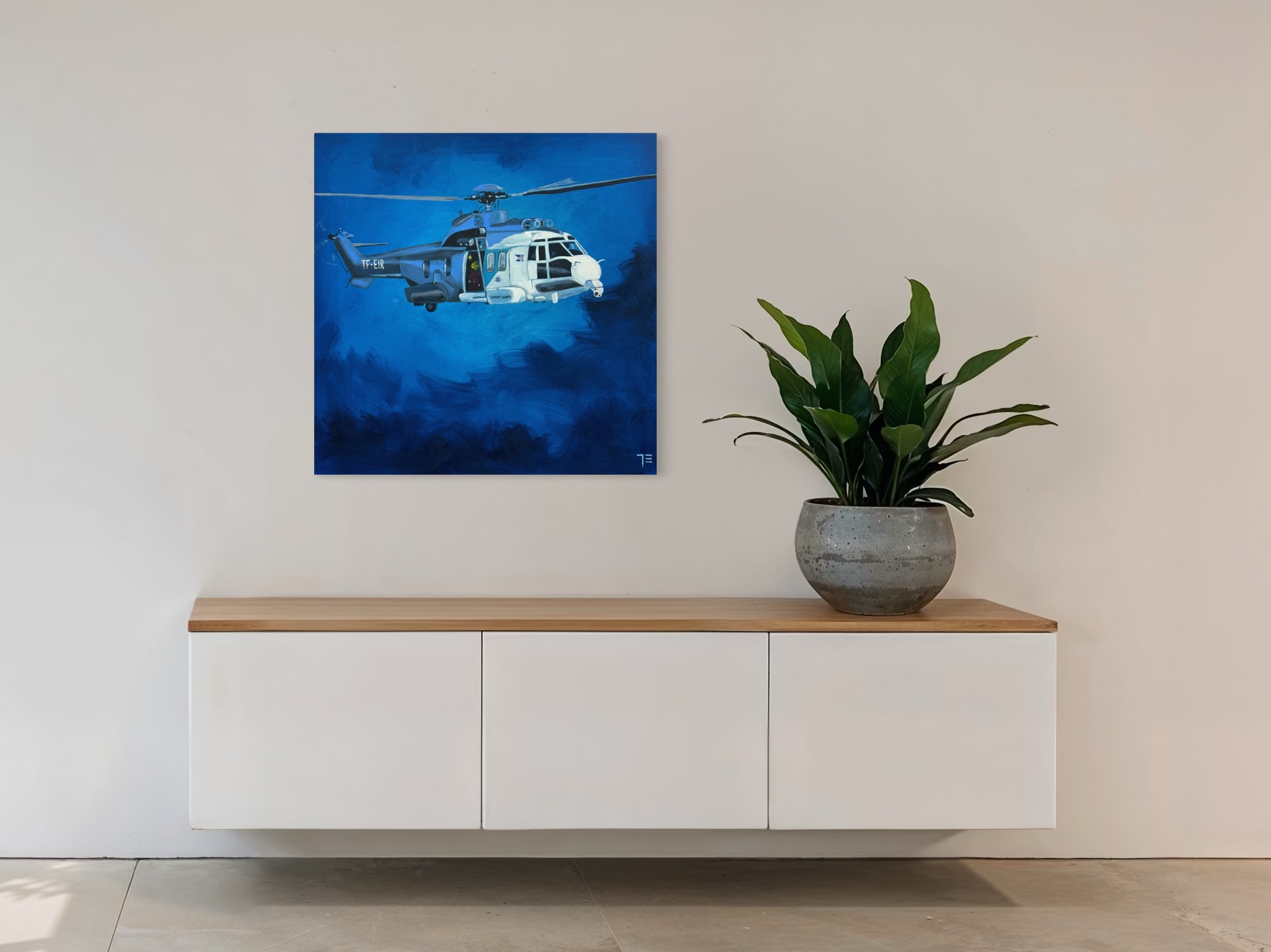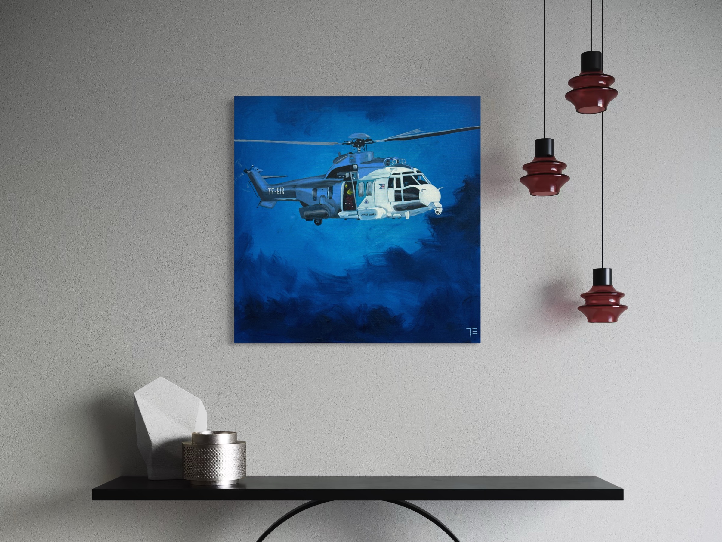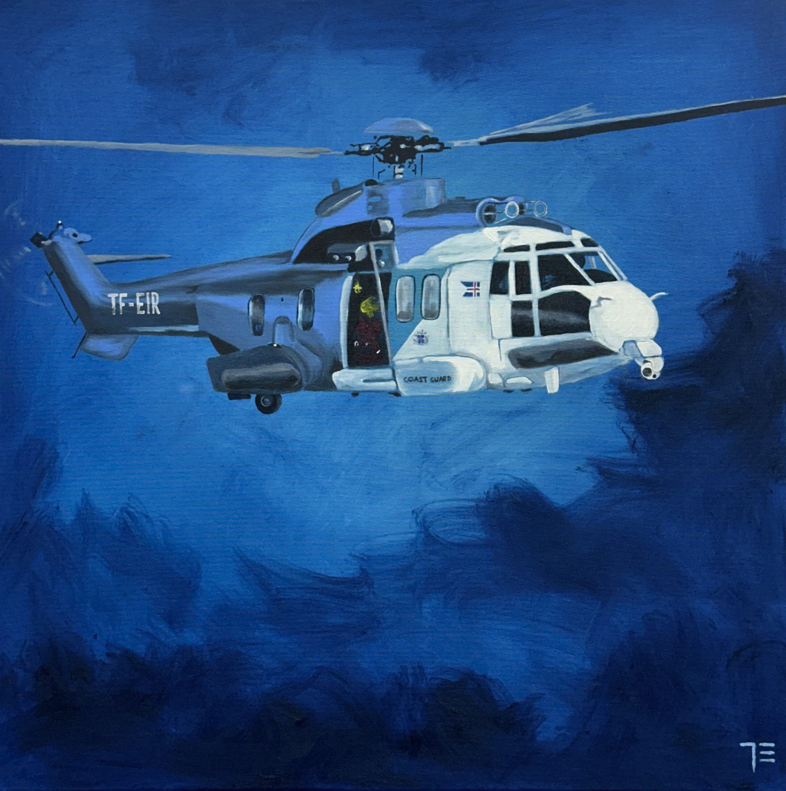 TF-EIR þyrla Landhelgisgæslunnar. Stærð: 80x80cm. Olía á striga. English: Icelandic Coast Guard helicopter TF-EIR Size: 80x80cm. Oil on canvas. Contact us for international shipping.